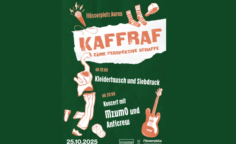 Kaffraf startet um 18:00 Uhr mit einem Kleidertausch. Das bedeutet: Bring Kleidung mit, die du nicht mehr trägst, und tausche sie vor Ort gegen neue Lieblingsstücke ein. Zusätzlich könnt ihr eure Fundstücke direkt mit coolen Siebdruckmotiven aufwerten.