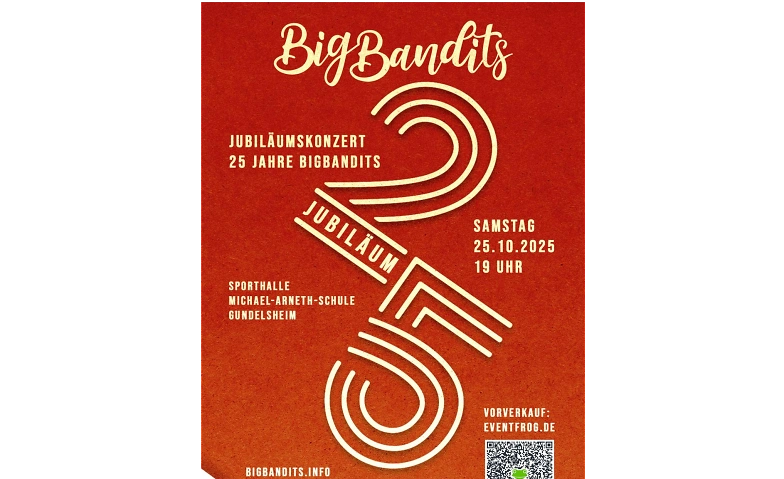 Der Musikverein Gundelsheim e.V. lädt herzlich zum Jubiläumskonzert der Big Bandits ein, die in diesem Jahr ihr 25-jähriges Bestehen feiern. Das Konzert findet am Samstag, den 25. Oktober, um 19 Uhr in der Sporthalle der Michael-Arneth-Schule statt, Einlass ist ab 18 Uhr.
