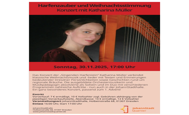 Das Konzert der "Singenden Harfenistin" Katharina Müller verbindet klassische Weihnachtsmusik und -lieder mit Texten und Erinnerungen bedeutender Dresdner Persönlichkeiten sowie Geschichten rund um regionale Bräuche.