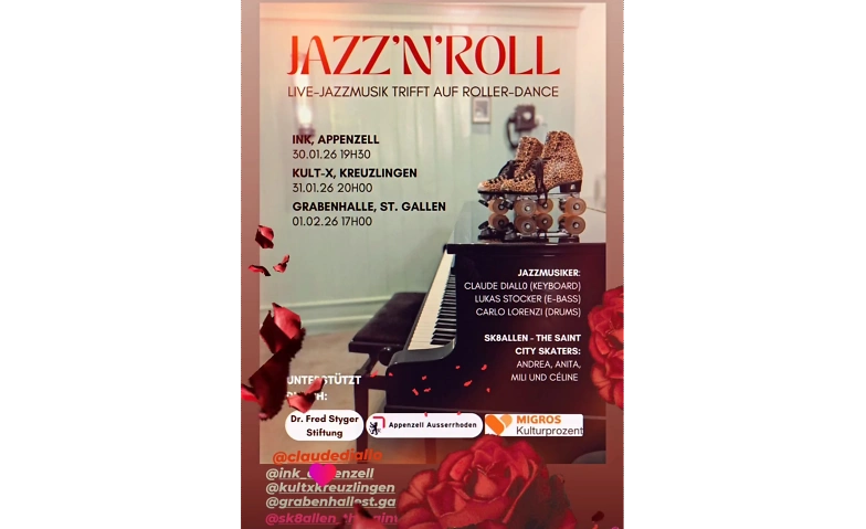 LiveJazzmusik trifft auf Roller-Dance  - Sk8allen   & Jazz bringt zwei Welten zusammen, die auf den ersten Blick kaum verbindbar scheinen - Rollerskating und Live-Jazz. In dieser einmaligen Premiere treffen die rhythmisch-dynamischen Bewegungen von Skaterinnen der Sk8allen auf die klangvolle Vielfalt professioneller Jazzmusiker. Was entsteht, ist eine 60-minütige Performance voller Energie, Improvisation und Poesie auf Rollen. Das Projekt vereint choreografierte Skating-Sequenzen, intuitive Interaktion und live gespielte Jazzmusik - darunter Originalkompositionen von Claude Diallo und Carlo Lorenzi sowie ausgewählte Jazz-Standards. Die Musik entsteht im Moment - genau wie die Bewegungen auf acht Rollen. Ein mutiges Crossover zwischen urbaner Bewegungskultur und musikalischer Kunst.