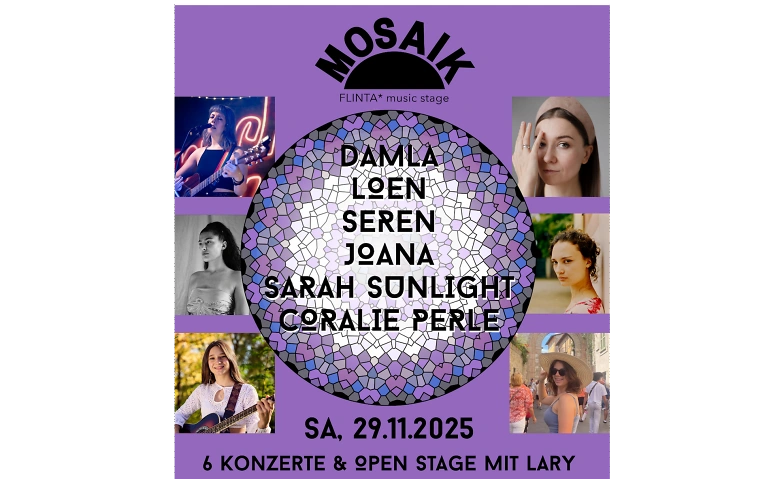 Im Oktober 2015 haben wir unsere erste Stage für Newcomer*innen - den Miezenabend - veranstaltet. Daraus wurde die MOSAIK FLINTA* music stage. Diesen Geburtstag wollen wir feiern mit einer Jubiläumsedition: 10 Jahre Newcomer-Stage am Samstag, den 29.11.2025! Euch erwarten wieder tolle Acts und jede Menge musikalische, kulinarische und spielerische Überraschungen! Eingeladen haben wir diesmal Damla (Ffm), JoAna (Bonn), Loen (Mannheim), Sarah Sunlight (Odenwald), Seren (Ffm) und Coralie Perle (Ffm). Die Open Stage wird von Lary (Ffm) eröffnet. Sing- und spielfreudige Menschen aus dem Publikum sind herzlich eingeladen, mitzumachen und gemeinsam mit anderen einen musikalischen Moment zu schaffen.
