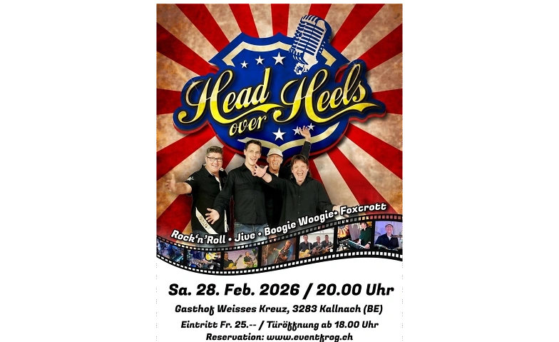 Head Over Heels bringen Boogie Woogie, Jive, Fox und Rock’n’Roll live auf die Bühne — Musik, die in die Beine geht und genauso gut einfach genossen werden kann.