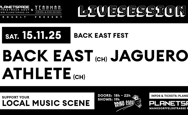 LIVE SESSION: BACK EAST FEST: BACK EAST, JAGUERO, ATHLETE info@planetspade.ch, Wankdorffeldstrasse 96, 3014 Bern Tickets