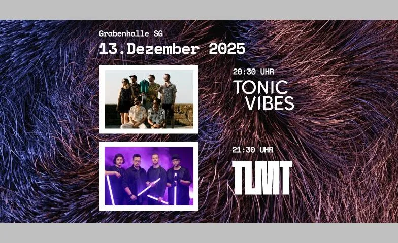 Wir taufen unsere Songs. Endlich ist es soweit. Wir holen nach, was 2020 nicht stattfinden durfte. Das wird keine normale Show. Das wird laut. Das wird echt.   Mit wuchtigen Riffs, grossen Melodien und einer ordentlichen Portion Gefühl holen TLMT den Spirit der 90er Rock-Szene ins Heute. Laut genug, um die Wände beben zu lassen. Ehrlich genug, um lange nachzuwirken. TONIC VIBES Treibende Grooves, funky Riffs, sphärische Klänge und eine mitreissende Stimme geben der St.Galler Band ihr unverkennbares Markenzeichen. Das sind die Zutaten von TONIC VIBES, womit sie rockige Songs gepaart mit poppig, melodiösen Elementen liefern. Special Ticket Hol dir das Special Ticket, komm eine Stunde früher und stoss mit uns vor der Show an. Mit Glühwein oder Punsch und einem Happen zu essen. Im Special Ticket dabei: ein exklusives Acoustic-Liveset, in dem wir die rohe und unverfälschte Seite einiger Songs zeigen. Programm 19:00 Uhr  -  Türöffnung Special Ticket (Glühwein & Food) 19:45 Uhr  -  Acoustic Liveset 20:00 Uhr  -  Türöffnung Normales Ticket 20:30 Uhr  -  TONIC VIBES 21:30 Uhr  -  TLMT [gallery columns="4" ids="eyJ1cmwiOiJodHRwczpcL1wvd3d3LmdyYWJlbmhhbGxlLmNoXC93cC1jb250ZW50XC91cGxvYWRzXC8yMDI1XC8xMFwvMjAyNV8xMl8xM19UTE1ULmpwZyIsInRpdGxlIjoiMjAyNV8xMl8xM19UTE1UIiwiY2FwdGlvbiI6IiIsImFsdCI6IiIsImRlc2NyaXB0aW9uIjoiIn0=,eyJ1cmwiOiJodHRwczpcL1wvd3d3LmdyYWJlbmhhbGxlLmNoXC93cC1jb250ZW50XC91cGxvYWRzXC8yMDI1XC8xMFwvMjAyNV8xMl8xM19Ub25pY1ZpYmVzLmpwZyIsInRpdGxlIjoiMjAyNV8xMl8xM19Ub25pY1ZpYmVzIiwiY2FwdGlvbiI6IiIsImFsdCI6IiIsImRlc2NyaXB0aW9uIjoiIn0="]