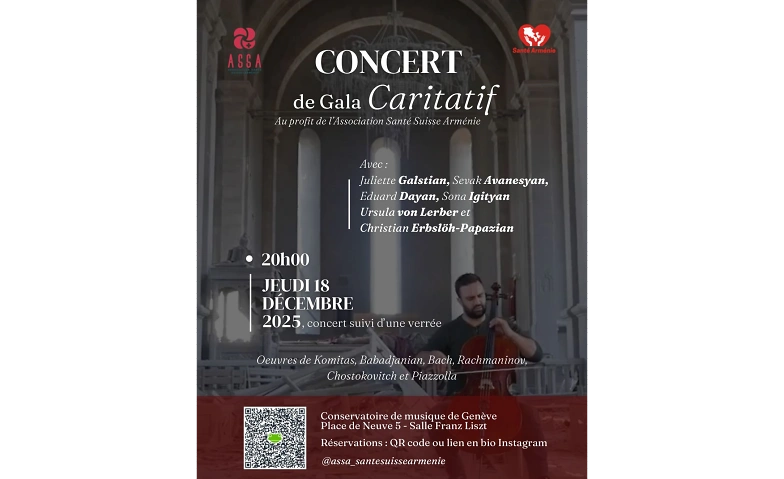 L'Association Sante Suisse-Armenie (ASSA) vous invite à un concert de Gala caritatif inoubliable le 18.12.2025 au Conservatoire de Musique de Genève. Les fonds seront versés en intégralité en faveur de projets en Arménie et pour les arméniens, notamment pour soutenir le projet Wings qui vise la réhabilitation psychosociale d'environ 800 enfants et famille déplacés d'Artsakh à travers plusieurs villes en Arménie (Erevan, Gyumri, Kapan, Halidzor), mais également en faveur de projets de ses membres comme les soins de clinique mobile dans les régions frontalières de l'Arménie ainsi que le projet de prise en charge des psychotraumatismes de guerre et la formation des professionnels de santé en Arménie.
