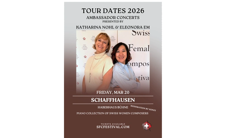 Wie um Gottes Willen wird man Komponistin?Kommen Sie und erleben Sie Musik aus heutigen Zeit, komponiert in der Schweiz!Tauchen Sie mit den Künstlerinnen Eleonora Em und Katharina Nohl, die auch Publizistinnen, Organisatorinnen und Botschafterinnen sind, in eine Musikwelt ein, die auf der Tradition basiert. Die beiden spielen Musik von lebenden Komponistinnen der Schweiz. Im Konzertprogramm erklingen Werke aus dem neu erschienenen Notenbuch Piano Collection(Universal Edition), sowie einige besondere Highlights: 4-händige Stücke, die einen wunderschönen Beitrag zur schweizerischen Musikszene bilden.