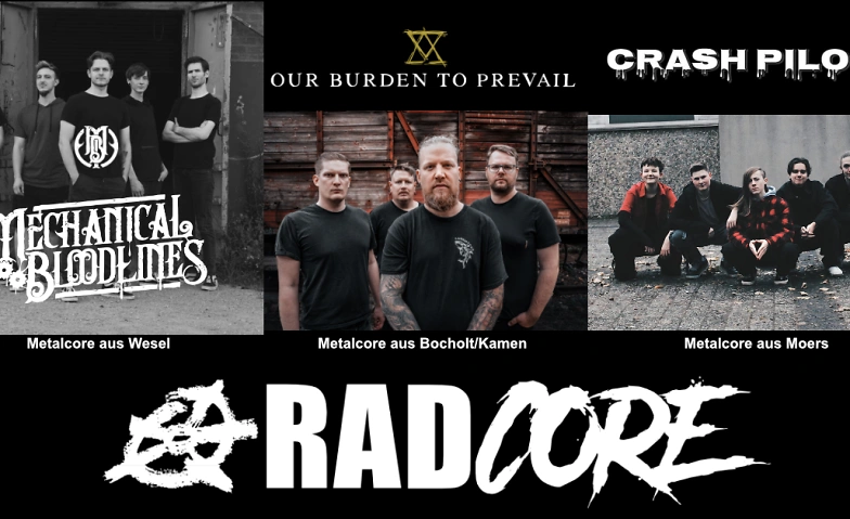 Radcore am 28.02.26 Samstag mit Mechanical Bloodlines (Metalcore aus Wesel) + Our Burden to Prevail (Deathcore Band aus Bocholt/Kamen) + Crash Pilots (Metalcore aus Moers)