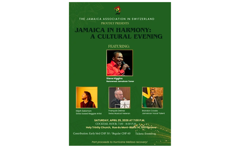 The Jamaica Association in Switzerland is hosting a fundraising concert featuring renowned Jamaican Tenor, Steve Higgins; Swiss-based Reggae Artiste, Elijah Salomon; Veteran Swiss Musician, François Detraz; and homegrown Jamaican Vocal Talent, Brandon Crooks.