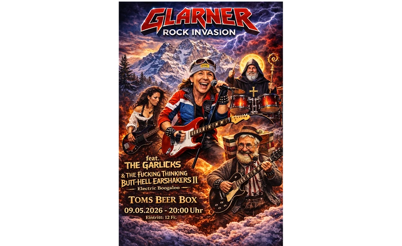 Äm Samschtig, 09.05., falled d Rockveteranä vu The Garlicks und The Fucking Thinking Butt-Hell Earshakers II - Electric Boogaloo z Chur ih und zeiged ihrnä Bündner Nachberä, dass d Glarner nöd nur Häxä, sondern au d Budä zum Brännä brännä bringä loh chänd. Säb i dr Toms Beer Box.