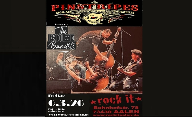 The Pinstripes & The Booze Bandits. Freitag 6.3.26, Rock It Aalen.                                                                                      Kick-Ass Rockabilly, so bezeichnen The Pinstripes ihren Musikstil. Irgendwie treffend, für eine Band die neben eigenen Kompositionen Coverversionen wie z.B. von Jimy Hendrix (Voodoo Chile), AC/DC (Whole Lotta Rosie), Motörhead (Ace of Spades), Chris Rea (Road to Hell), Misfits (Dig up her Bones), Metallica (Nothing Else Matters) im Programm hat, welche in ihrem eigenen „Kick-Ass Rockabilly-Style“ dargebracht werden.                                                                                          Durch zahlreiche Auftritte bei verschiedenen Festivals als auch in kleineren Szene Clubs oder großen Open Air Veranstaltungen, erspielte sich diese Band eine regionale und überregionale Fangemeinde (Summern Breeze, With Full Force, Rock of Ages, Rock am See, Walldorf Weekender, Rockabilly Days).