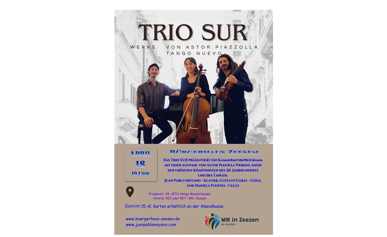 Das TRIO SUR präsentiert ein Kammermusik-Programm mit einer Auswahl von Astor Piazzolla Werken, einer der größten Komponisten des 20.Jahrhunderts und des Tangos.