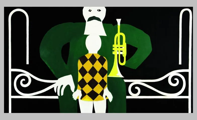 Autobiografisches und Fiktion verschmelzen zu einem Bildganzen. Bildelemente, wie das weisse Eisenbettgestell, das Franz Gertsch in einer Ferienwohnung abgezeichnet hatte, oder die goldene Trompete, die er gebraucht gekauft hatte, werden als Bildelemente wiederholt aufgenommen und variiert.