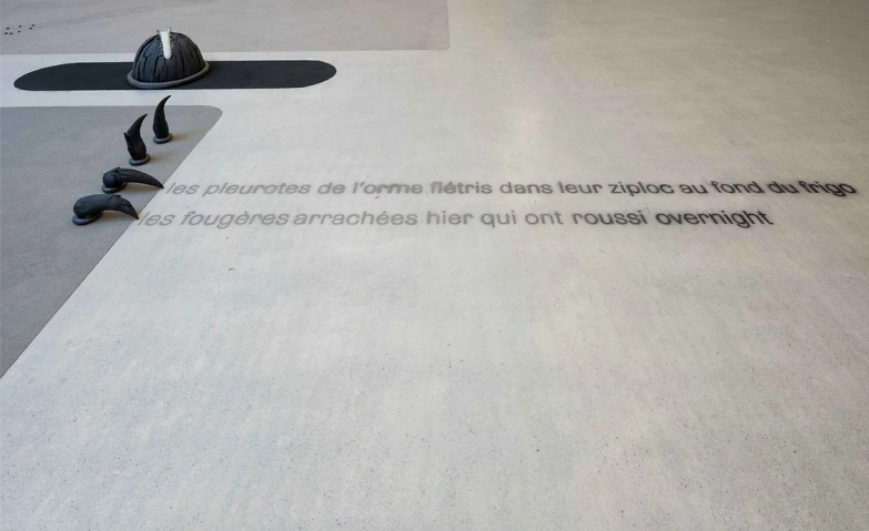 Maude Léonard-Contants Bildwelt speist sich aus Sprache, der Gestalt von Buchstaben, Worten und Satzfragmenten, und manifestiert sich in eigenwilligen, oft raumfüllenden Bodenarbeiten. Sprache ist selbst dann spürbar, wenn sich ihre Werke am Rande der Verständlichkeit bewegen – Léonard-Contant navigiert.