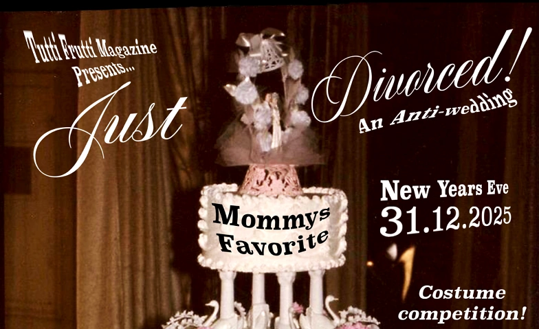 Let's divorce 2025 in style ! You and your heartaches are bitterly invited to this nonunion, celebrating the sacred bond between us and the expiring year. Tutti Frutti invites you to stamp collectively and scream in glamorous misery! Grieving spouses and treacherous bachelors will pour their broken hearts out on stage - drag artists, musicians and performers alike !