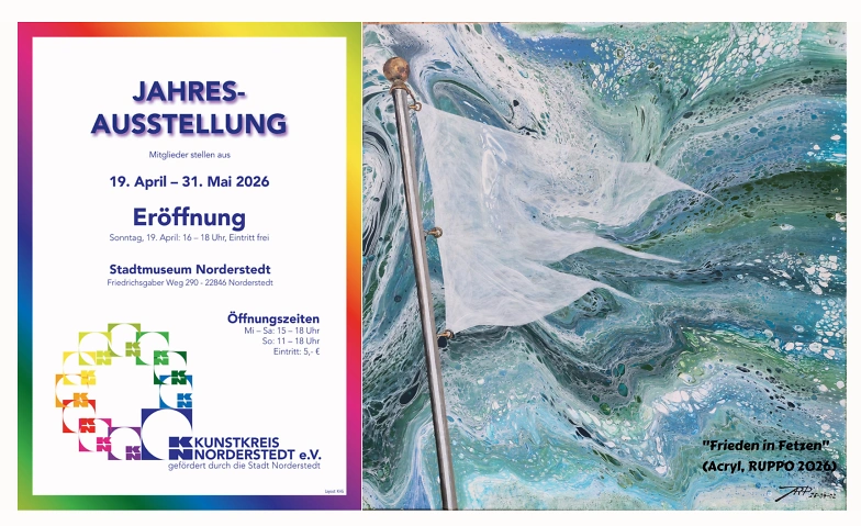 Anke Rupprecht-Poßinke (RUPPO) Im Diptychon „Frieden in Fetzen“ wird das Symbol der weißen Fahne aufgegriffen und in seiner Auflösung gezeigt. Die Arbeit thematisiert den fragilen Zustand von Frieden und den Moment, in dem Stabilität ins Wanken gerät. Die Ausstellung präsentiert aktuelle Werke der Mitglieder des Kunstkreises Norderstedt e.V. und läuft bis zum 31. Mai 2026.