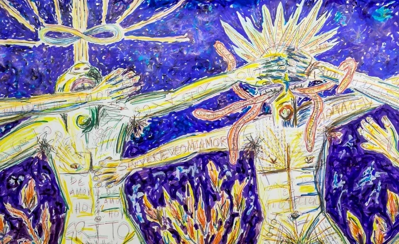 Following the mattress, Lucas moved on to create large-format works on paper, which serve as vivid, dynamic canvases. In Lucas Goubert’s practice, poetry and writing come first; the visual elements always derive from his words. The words are embedded within the compositions, vibrantly weaving through the anthropomorphized shadow lines, chaotic energy, rough brush strokes—almost brutal in their intensity—and nervously sketched forms that seem to pulse with urgent life. The words breathe and scream across the paper, infusing the work with raw emotion and visceral energy. From the start of his artistic journey—initially marked by spontaneous sketches inspired by poets like Mistral, Lorca, and Whitman—Lucas’s art has blossomed into a language full of archetypal figures—mystics, surreal creatures, and mythic beings—living passionately in their worlds, unfiltered and authentic. Using a palette of collage, oils, inks, and waxed crayons, he conjures scenes pulsating with Latin American magic realism, Jungian archetypes, Lovecraftian shadows, punk’s untamed spirit, Basquiatian naivety, and Chopinian Romanticism.