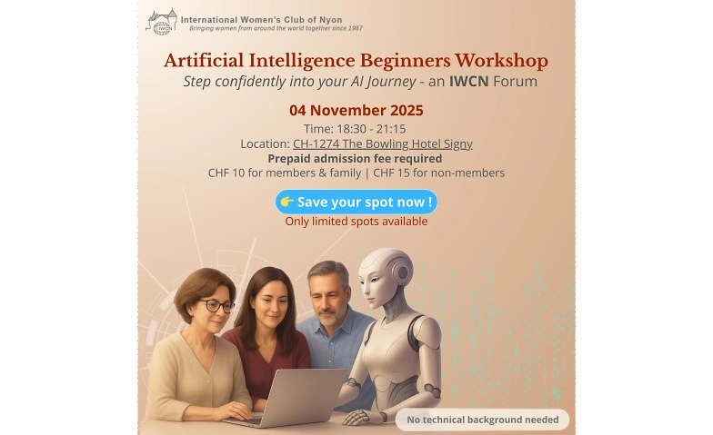 Step confidently into your Artificial Intelligence journey with this beginner-friendly workshop organised by the International Women’s Club of Nyon (IWCN).