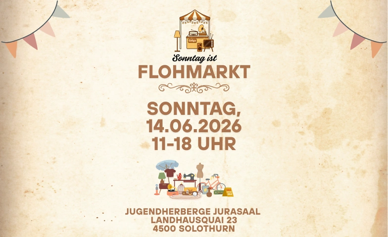 Am Sonntag, 14.06.2026, findet von 11:00 bis 18:00 Uhr unser Flohmarkt in der Jugendherberge JURASAAL, Landhausquai 23, 4500 Solothurn statt.