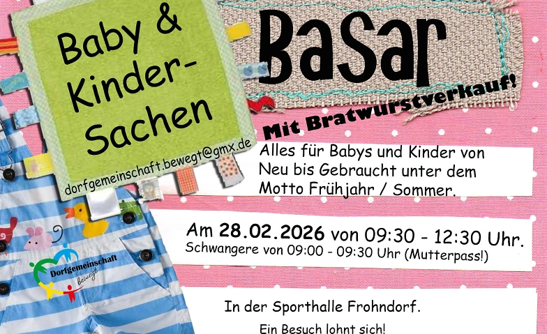 Baby- und Kindersachenbasar Frühjahr/Sommer  in Frohndorf Sporthalle Frohndorf, Dorfplatz 1, 99610 Sömmerda Tickets