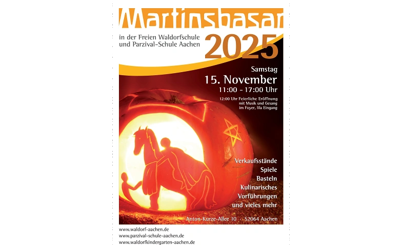 Am Samstag, den 15. November 2025, laden die Freie Waldorfschule Aachen, die Parzival-Schule Aachen und der Waldorfkindergarten ganz herzlich zum traditionellen Martinsbasar ein. Von 11:00 bis 17:00 Uhr verwandeln sich das Schulgelände und die liebevoll gestalteten Klassenräume zu fantasievollen Spiel- und Bastelstationen, stimmungsvollen Verkaufsständen und gemütlichen Cafés für Groß und Klein.