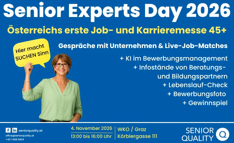 Der Senior Experts Day bringt Erfahrung, Chancen und Unternehmen zusammen. Bereits zum 4. Mal findet Österreichs erste Job- und Karrieremesse speziell für Menschen ab 45 Jahren statt – diesmal wieder in Graz.