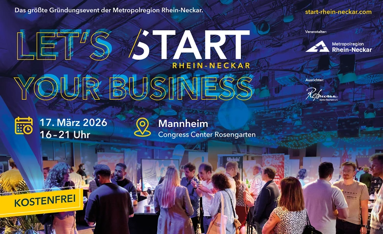 Dann verpasse nicht, das größte kostenfreie Gründungsevent der Metropolregion Rhein-Neckar am 17. März 2026 von 16:00 - 21:00 Uhr im Congress Center Rosengarten in Mannheim.