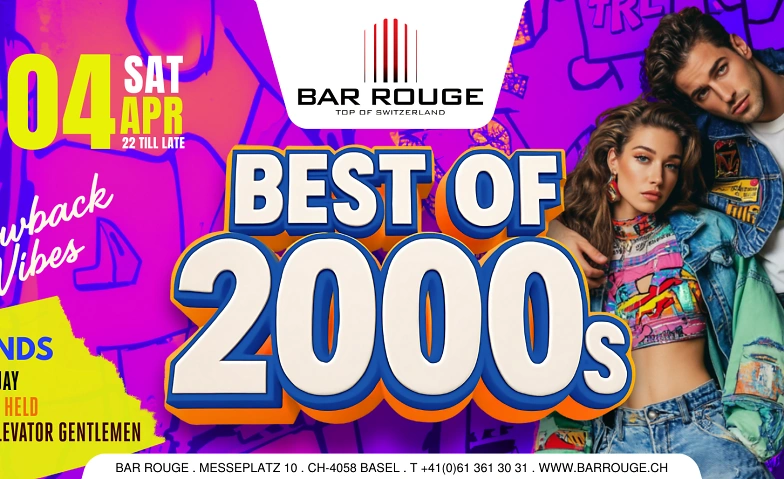 Geniesse auf 105 Metern Höhe trendige Cocktails von stylishen Bartendern und bestaune den atemberaubenden Blick auf Basel. Tanze auf zwei Floors zu Club Classics, RnB, Latin und angesagten Charts im 31. Stock oder tauche im 30. Stock ein in die Ära von Hits wie Britney Spears' "Toxic", OutKast's "Hey Ya!", Rihanna's "Umbrella" und Lady Gaga's "Poker Face". Komm zur Best of 2000 Party, bring deine Freunde mit, zeig uns deine angesagtesten Dance Moves und geniesse eine unvergessliche Nacht. Join the club!