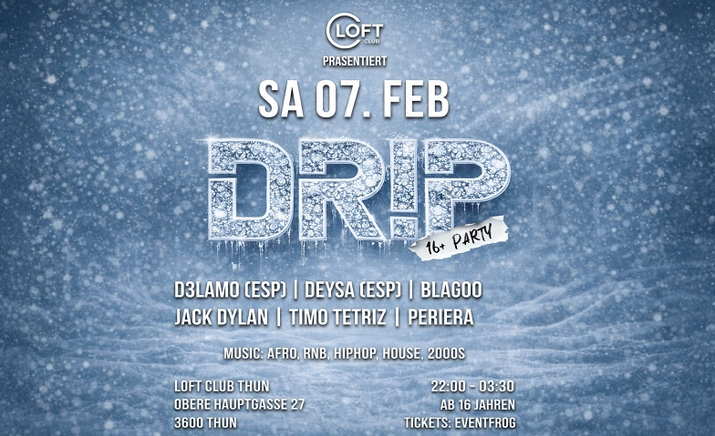 DR!P - die einzige(!) Eventreihe ab 16 Jahren - geht in die nächste Runde! Am Samstag, 07. Februar 2026 wird der Loft Club Thun wieder vom Thuner Partyvolk zerlegt! Ab 22:00 Uhr geht’s los mit einer Nacht, die du so schnell nicht vergessen wirst – feier mit uns in einer heissen Nacht mit vielen Highlights! 💦