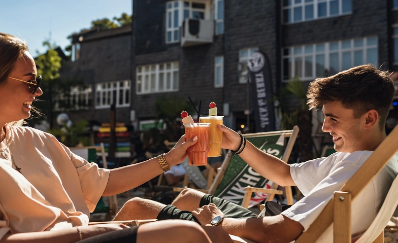 Das Gefühl von Urlaub direkt vor der Haustür wird durch den Urlaubsstrand mitten auf dem Platz perfekt ergänzt. Bis zu 50 Tonnen Sand, Palmen, Liegestühle und das angenehme Sommerwetter versetzen jeden Besucher sofort in karibische Stimmung. Dazu gibt es täglich Live-Musik auf der Bühne am Sandstrand. Alle Gäste sind herzlich eingeladen, beim Tanzen mitzumachen oder einfach entspannt die Atmosphäre zu genießen.