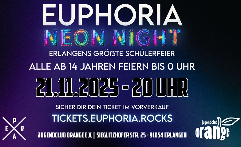 Euphoria: NEON NIGHT Jugendclub Orange e.V., Sieglitzhofer Straße 25, 91054 Erlangen Tickets