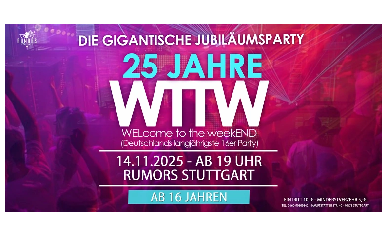 Am 14.11.2025 findet nun das 25-jährige Jubiläum von WTTW im Rumors Club statt, das seit Herbst 2010 die aktuelle Location von Stuttgarts langjährigster und erfolgreichster 16er Party ist.