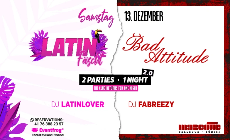 Unter dem Motto „2 Parties – 1 Nacht“ vereinen sich zwei der angesagtesten Eventlabels der Stadt – Latin Fäscht und Bad Attitude – für ein einmaliges Erlebnis. Es ist die letzte Gelegenheit, die unvergleichliche Atmosphäre des Mascotte Clubs zu spüren, zu tanzen, zu feiern und Geschichte zu schreiben. Die Gäste erwartet eine wilde Fusion: Latin Beats & Reggaeton Vibes treffen auf Urban Sounds, Hip-Hop & Afro Tunes. Zwei Welten, ein Club, eine Nacht – die perfekte Symbiose, die Zürich so noch nicht erlebt hat.