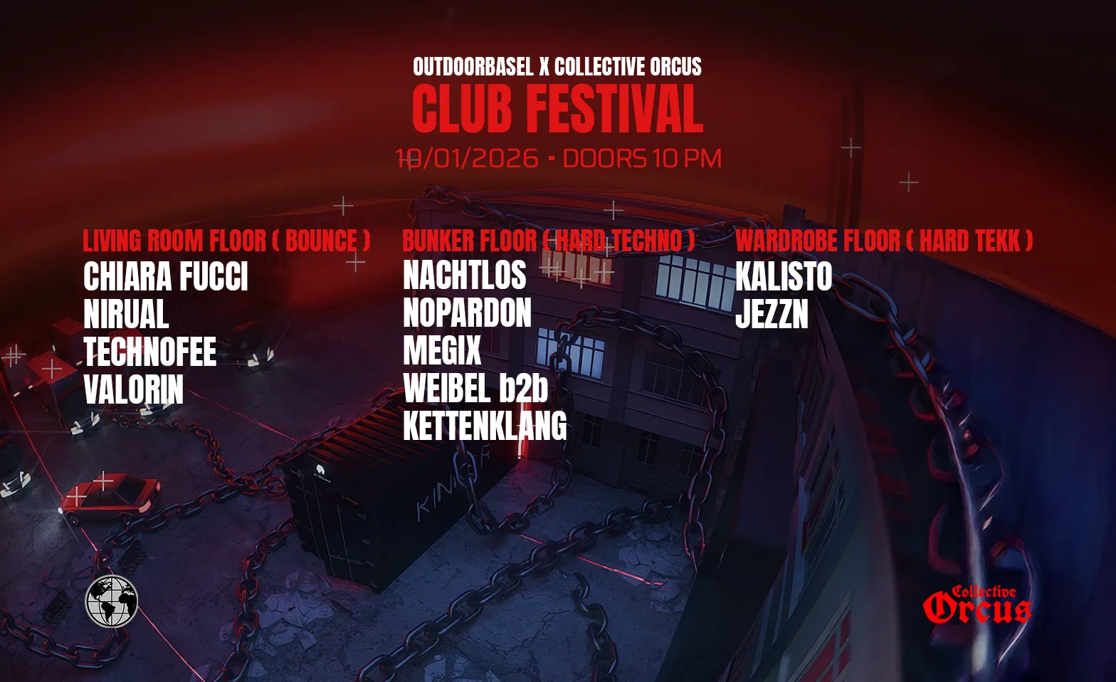 We are extremely happy to announce that we can organize a free entry Clubfestival! Together with the Collective Orcus we are organizing an event for you on 10.01.2026 with 3 floors! we are looking forward tearing the place apart!