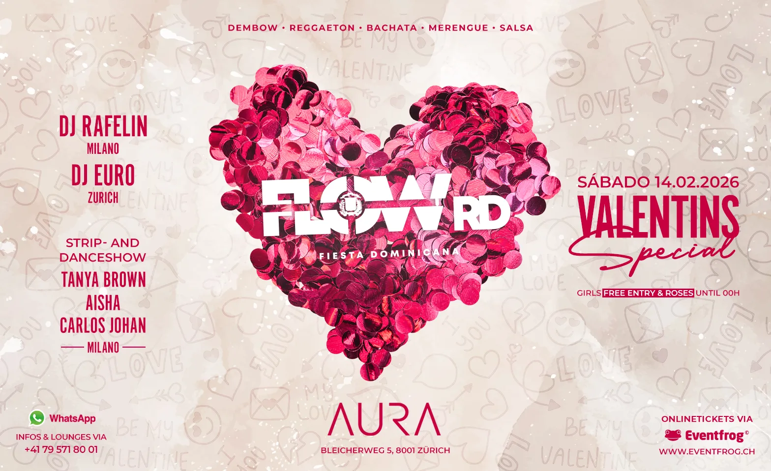 Amor, Ritmo & Deseo. Am 14. Februar 2026, zum Valentinstag, laden wir euch ein zu einer Nacht voller Leidenschaft, Musik und Connection – das FLOW RD Valentine's Special im exklusiven Aura Club Zürich.