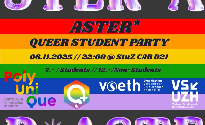 PolyUniQue hat das Vergnügen, Euch zur Aster* Party einzuladen. Die Aster* ist eine studentische Party für LGBTQIA+ Leute und Freunde, alle sind willkommen! Wir können es kaum erwarten, Euch dort zu sehen und gemeinsam eine unvergessliche Nacht zu verbringen. Du wirst mit Bargeld oder Twint bezahlen können, keine Karte. Die Party ist 18+.