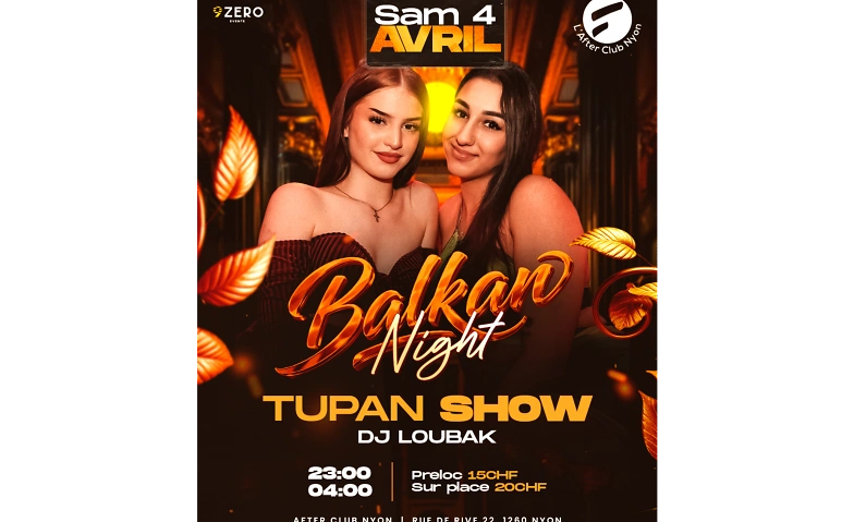 C'est du sérieux!! C'est confirmé!! La première soirée des Balkans sur la région de la Côte (Nyon), l'ambiance sera au plus HAUT niveau. Vous aurez le droit à un SHOW EXCEPTIONNEL de TUPAN et de songs phares des Balkans mixés par le Dj montant LOUBAK et Dj Lil M et son équipe au sein de l'After Club, un acceuillant et chaleureux. Les Balkans, une époque qu'on ne peut pas oublier.