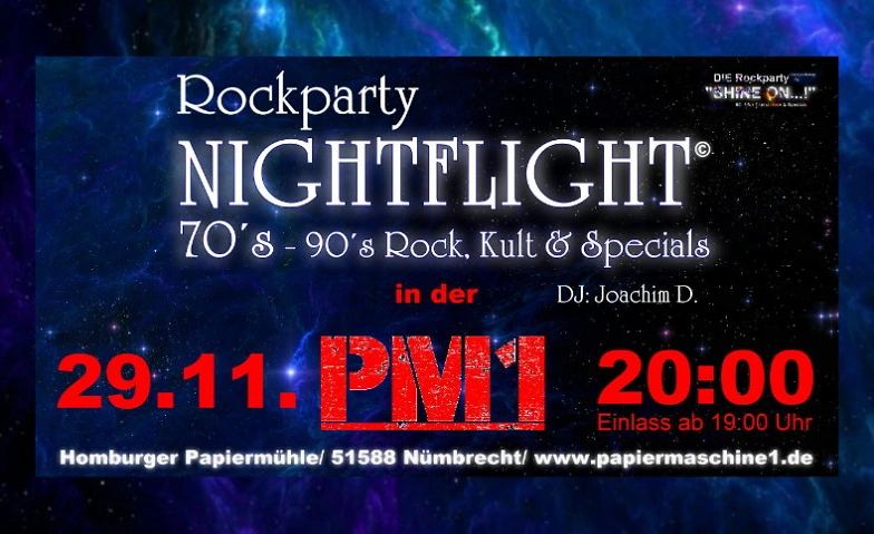 Rockparty NIGHTFLIGHT in der Homburger Papiermühle! Homburger Papiermühle (PM1), Homburger Papiermühle 1, 51588 Nümbrecht Tickets