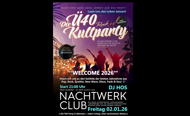 Rock44 ➤ °°WELCOME 2026°° » Die große Ü40 Neujahrs-Kultparty im Nachtwerk Club mit DJ HOS & einer bunten Mischung der Kulthits der letzten Jahrzehnte aus Pop, Rock, Synthie, New Wave, Disco, Funk & Soul 💃🕺🤸🍹🍻