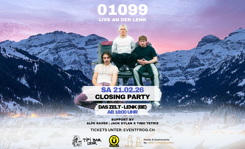 Mach dich bereit für die ultimative Closing Party in DAS ZELT an der Lenk im Simmental! Erlebe eine unvergessliche Nacht, in der wir gemeinsam mit erstklassiger Musik in einer unglaublichen Atmosphäre feiern. Die unvergleichliche Dresdner Rapper Crew 01099 wird euch so richtig einheizen. Zusätzlich versorgen euch ausgezeichnete DJs mit energiegeladener Musik, die garantiert alle auf die Tanzfläche zieht und die Stimmung bis in die frühen Morgenstunden kochen lässt.