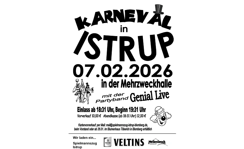 Erlebt die traditionelle Prunksitzung in Istrup mit viel Stimmung, mitreißenden Showeinlagen und einem lauten „Istrup Helau!“. Ein besonderes Highlight ist das legendäre Männerballett, das für beste Laune sorgt. Nach der Sitzung heißt es: Musik an und das Tanzbein schwingen – Karnevalsstimmung pur! 🎭🥳
