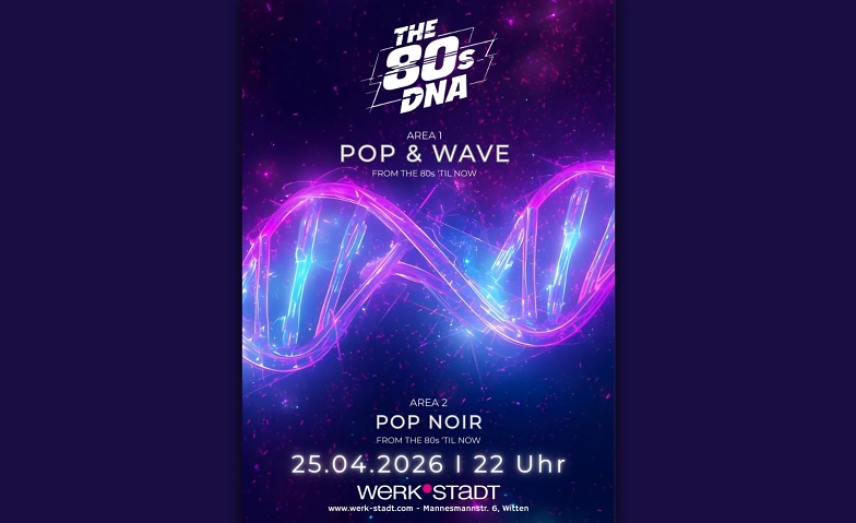 THE 80s DNA ist eine Partyreihe mit der wir keine Nostalgie reproduzieren, sondern Nostalgie weiterentwickeln. THE 80s DNA findet immer am letzten Samstag des Monats in der WERK°STADT statt und feiert ihren Auftakt am 28. Februar 2026 um 22:00 Uhr.