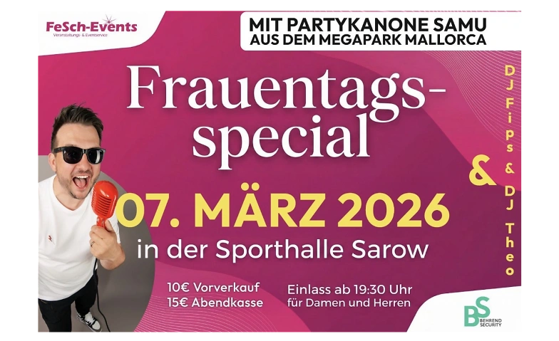 Feiern Sie den Frauentag in Sarow mit dem Frauentagsspecial von FeSch-Events! Erleben Sie eine mitreißende Party mit den angesagten DJs Fips und Theo sowie der Partykanone Samu direkt aus dem Mega-Park Mallorca.