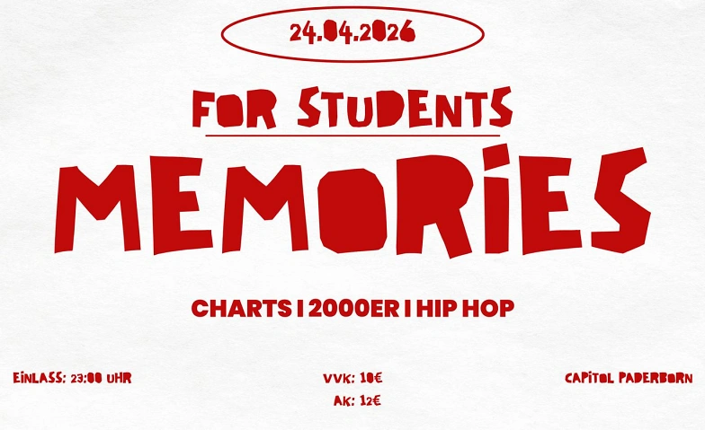 MEMORIES FOR STUDENTS ist die neue Partyreihe in Paderborn  von Studenten für Studenten. Am 24.03. startet die erste Veranstaltung im Kapitol und setzt den Fokus auf das, was in Paderborn lange gefehlt hat: ein starkes Partyangebot für Studierende.