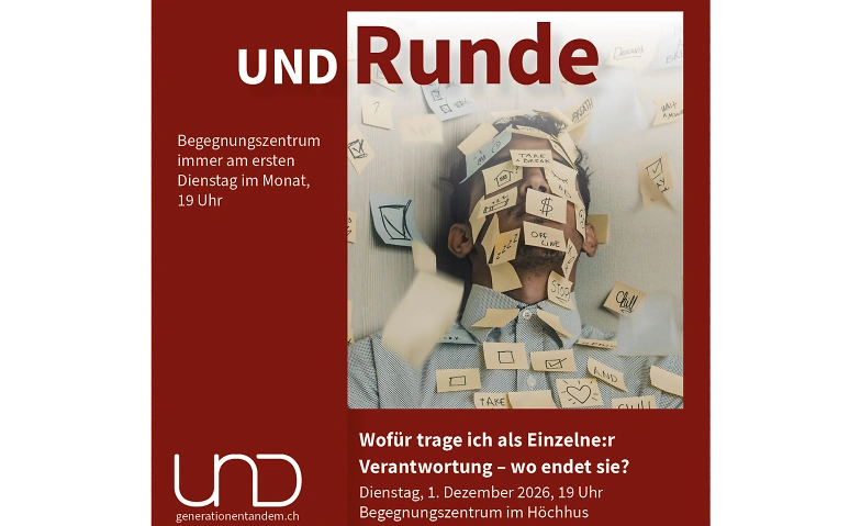 Die UND-Runde von UND Generationentandem im ist eine Art Stammtisch für den unverbindlichen Austausch. Ein Generationentandem lanciert zu Beginn das Gespräch mit eigenen Gedanken zu unterschiedlichen Themen von philosophisch bis politisch. Danach sind alle eingeladen, einen Antwortversuch zu wagen. Alle hören einander zu, alle können sich einbringen. Es ist ein ideales Gefäss, um neue Menschen kennenzulernen, unterschiedliche Meinungen zu hören und seinen eigenen Horizont zu erweitern.