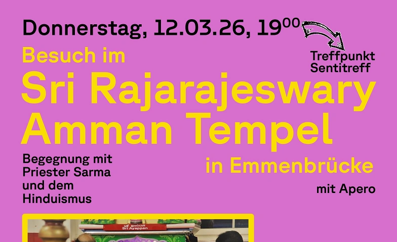 Der tamilische Hindutempel Sri Rajarajeswary Amman ist der Göttin Rājarājeśvarī geweiht, der «Königin der Könige». Sie vereint nach Hindu-Glauben weltliche und überweltliche Kräfte in sich und regiert als gütige Herrscherin über alles. Der Tempel befindet sich in einem grossflächigen Raum an der Emmenweidstrasse 58b im Industriegebiet von Emmenbrücke. Hauptpriester ist der in interreligiösen Kreisen bekannte Priester Saseetharen Ramakrishna Sarma. Bei einem gemeinsamen Besuch des Tempels, inklusive Apero, kommen wir mit Priester Sarma in Austausch - und mit einer faszinierenden Religion in Begegnung.