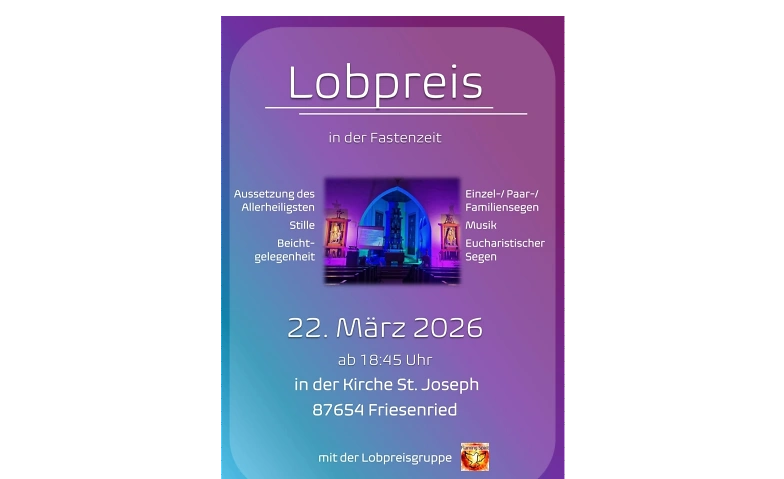 Am Sonntag, 22. März 2026, um 18:45 Uhr findet in der Kirche St. Joseph in Friesenried ein Lobpreis in der Fastenzeit statt.