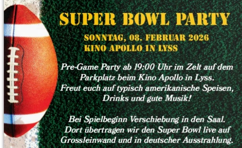 Super Bowl LX Live-Übertragung im Kino Apollo Lyss mit Vorparty und amerikanischen Speisen vom Gasthof Bären Lyss!