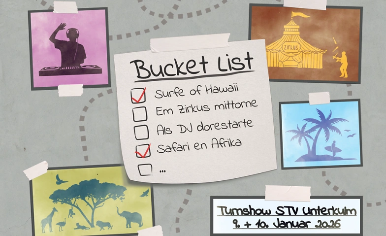 Alle – ob Jung oder Alt – haben Träume, die sie einmal im Leben verwirklichen möchten. Auch wir haben unsere ganz persönliche «Bucket List» zusammengestellt! Mit spektakulären akrobatischen Auftritten, mitreissenden Tanzeinlagen und humorvollen Sketches zeigen wir, was sich Turnerinnen und Turner wirklich wünschen.