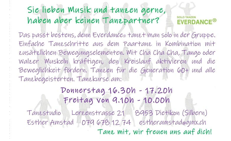 Alle sind willkommen, es sind keine Vorkentnisse nötig, Freude an Musik und Tanz reicht aus! :) Melden Sie sich für eine Schnupperlektion bei Esther Amstad, Everdance® Kursleiterin 079 678 12 74 oder estheramstad@gmx.ch