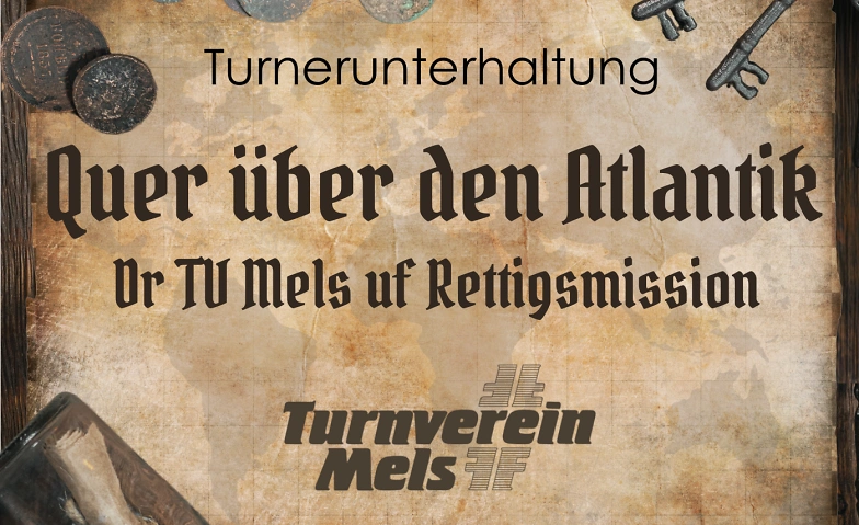 Der Turnverein Mels freut sich, dich im Verrucano zur Turnerunterhaltung 2025 unter dem Motto "Quer über den Atlantik - Dr TV Mels uf Rettigsmission" begrüssen zu dürfen.